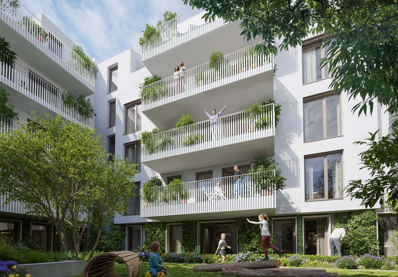 The two wings of the building enclose a protected courtyard designed as a biodiverse garden—a green retreat that integrates nature into everyday life and further enhances quality of living.