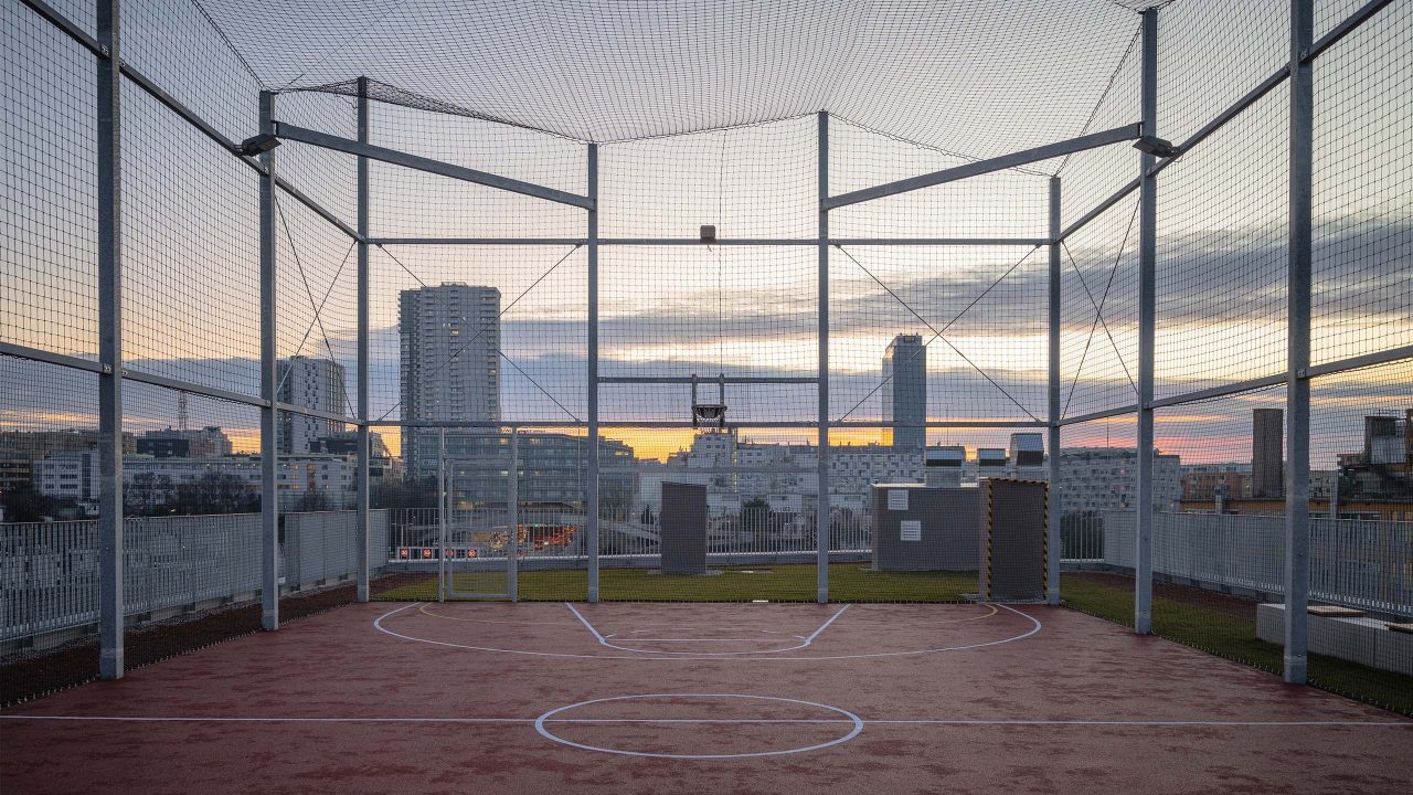 The architecture supports graduated social interaction: private rooms are grouped into small shared apartments that include communal living areas. Several of these units are arranged around semi-public social spaces that encourage exchange beyond the individual shared flats. The core idea was to create the social structure of a village within the building. Generous communal areas and a rooftop sports field provide additional spaces for interaction – all embedded within the urban fabric of the neighborhood.